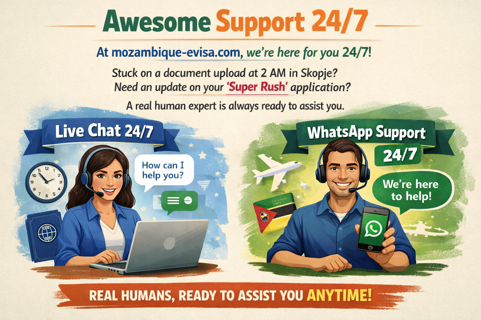 Yes! At mozambique-evisa.com, we pride ourselves on "Awesome Support." Our team is available 24/7 via Live Chat and WhatsApp. Whether you are stuck on a document upload at 2 AM in Skopje or need an update on your "Super Rush" application, a real human expert is always ready to assist you.